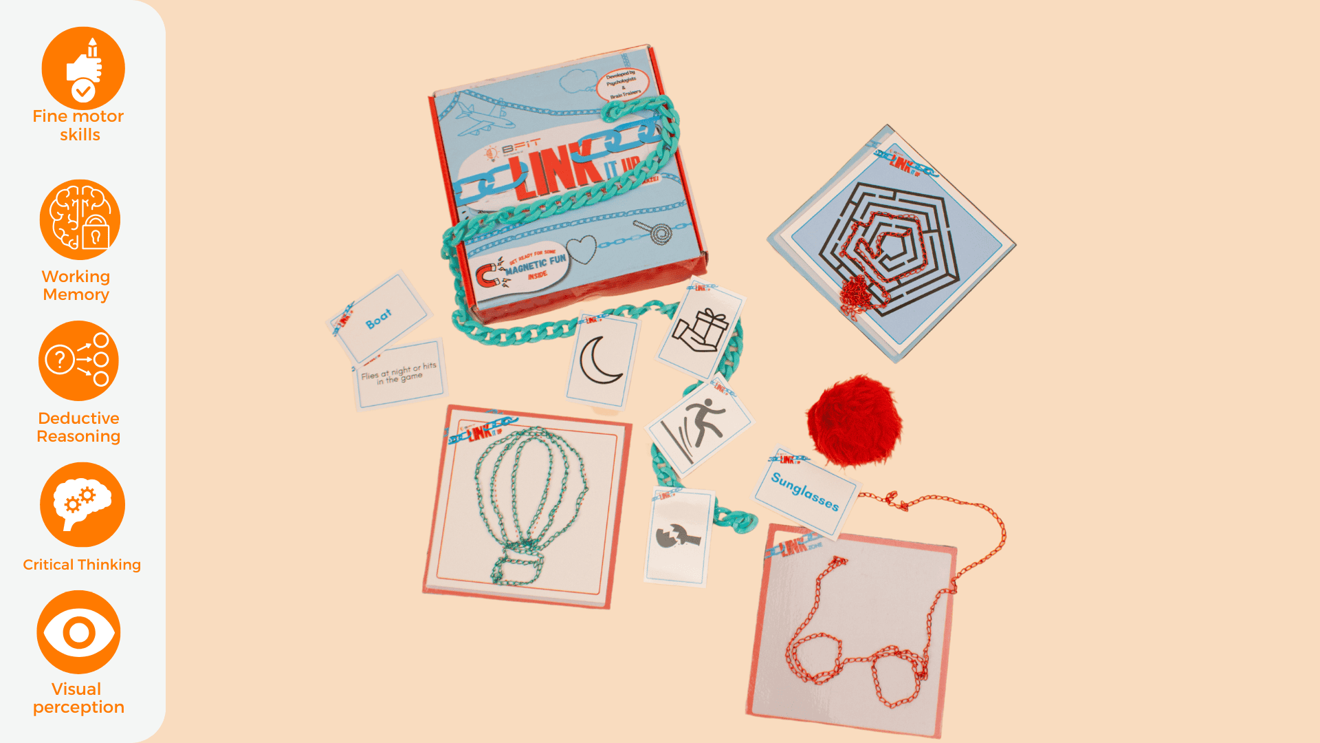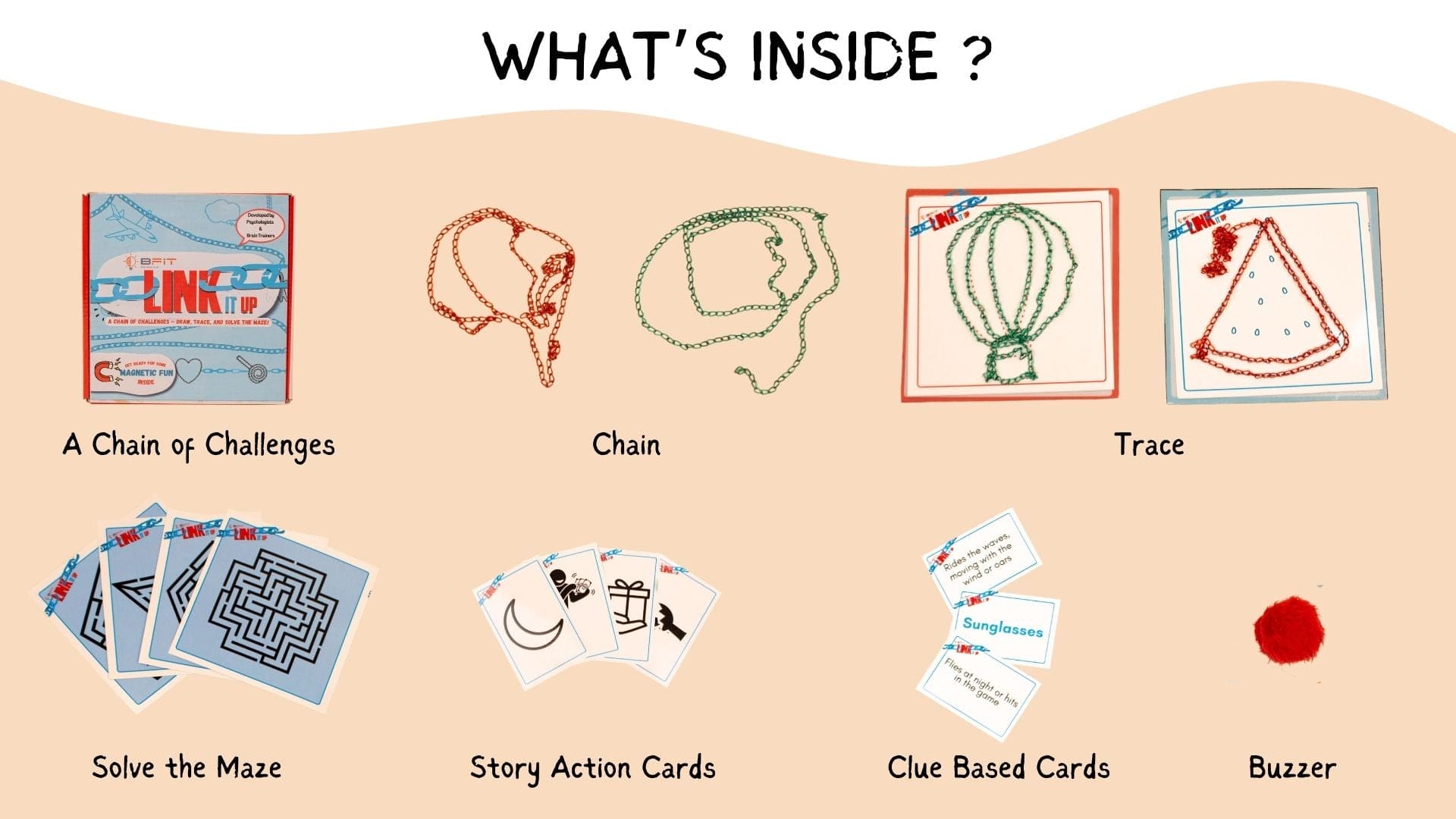 Unlock your creativity and problem-solving skills with Link it Up, the ultimate magnetic game where you build, draw, and explore using flexible magnetic chains on the exciting LinkZone! Perfect for players of all ages, this game offers 4 thrilling ways to play: Story Actions: Connect the story with the magnetic chain! Use the LinkZone to link key elements of a story and piece together a tale filled with twists and turns. Will your chain lead to a happy ending? Clue-Based Chain Drawing : Think fast and get creative! Use the LinkZone to draw pictures based on clues. Can your teammates guess what you're drawing before time runs out? Mazes : Navigate through tricky magnetic mazes on the LinkZone! Use your chain to solve puzzles and reach the end without losing your way. Tracing: Improve your fine motor skills & logic skills with trace the link as your follow the dotted lines but make sure not to trace over twice! With endless possibilities and tons of fun challenges, Link it Up sparks imagination, creativity, and quick thinking. Whether you’re tracing through a maze, linking a story, or drawing with chains, this game will keep you hooked for hours!