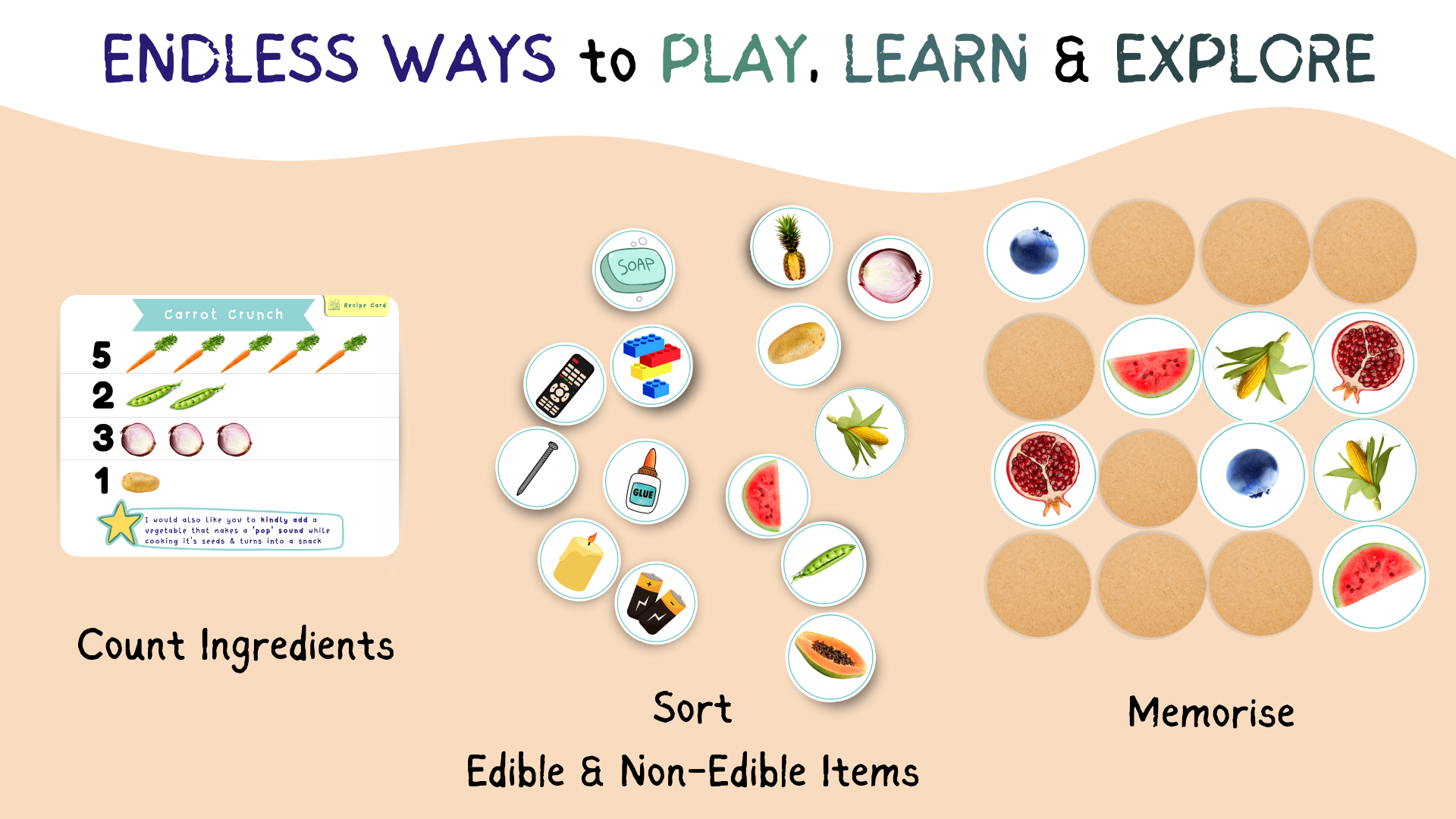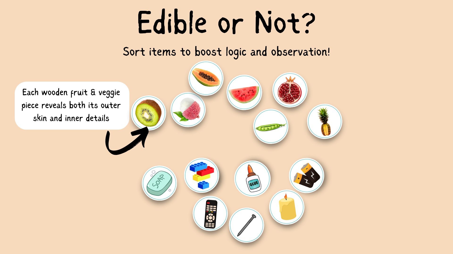 - Nature-Inspired Ingredients: 80 wooden tiles of fruits, vegetables, and non-edible items for immersive play.
